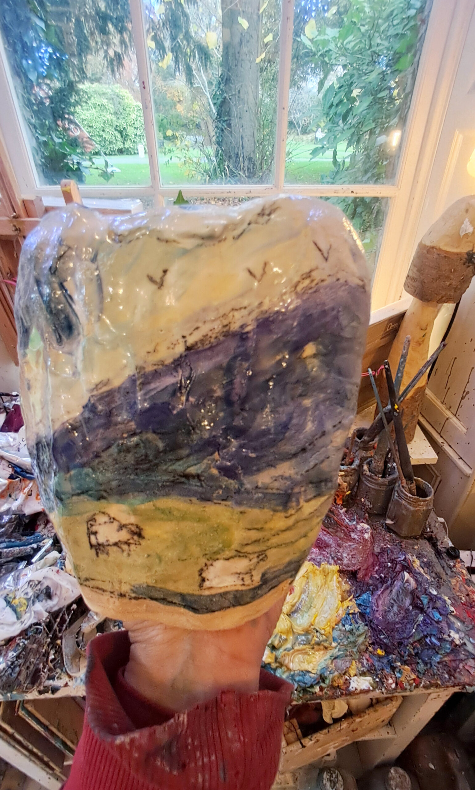 Really thick and sculptured vase. You can see my hand in it. Also hamd painted by me too.